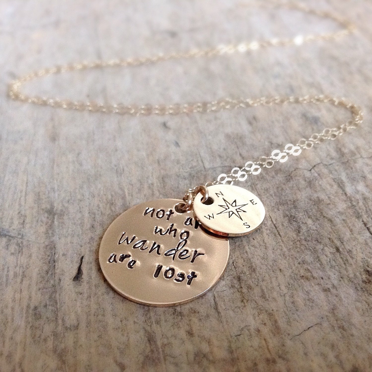 Part of the "Not All Who Wander Are Lost" collection, this necklace is the 14K Yellow Gold Fill style. The design is also available in other metals such as shiny sterling silver, oxidized sterling silver, and 14K rose gold fill. Entirely crafted by hand, this necklace is available in different lengths and perfects the bohemian fashion statement and can be layered with other skinny chains. Simply choose your preferred chain length.