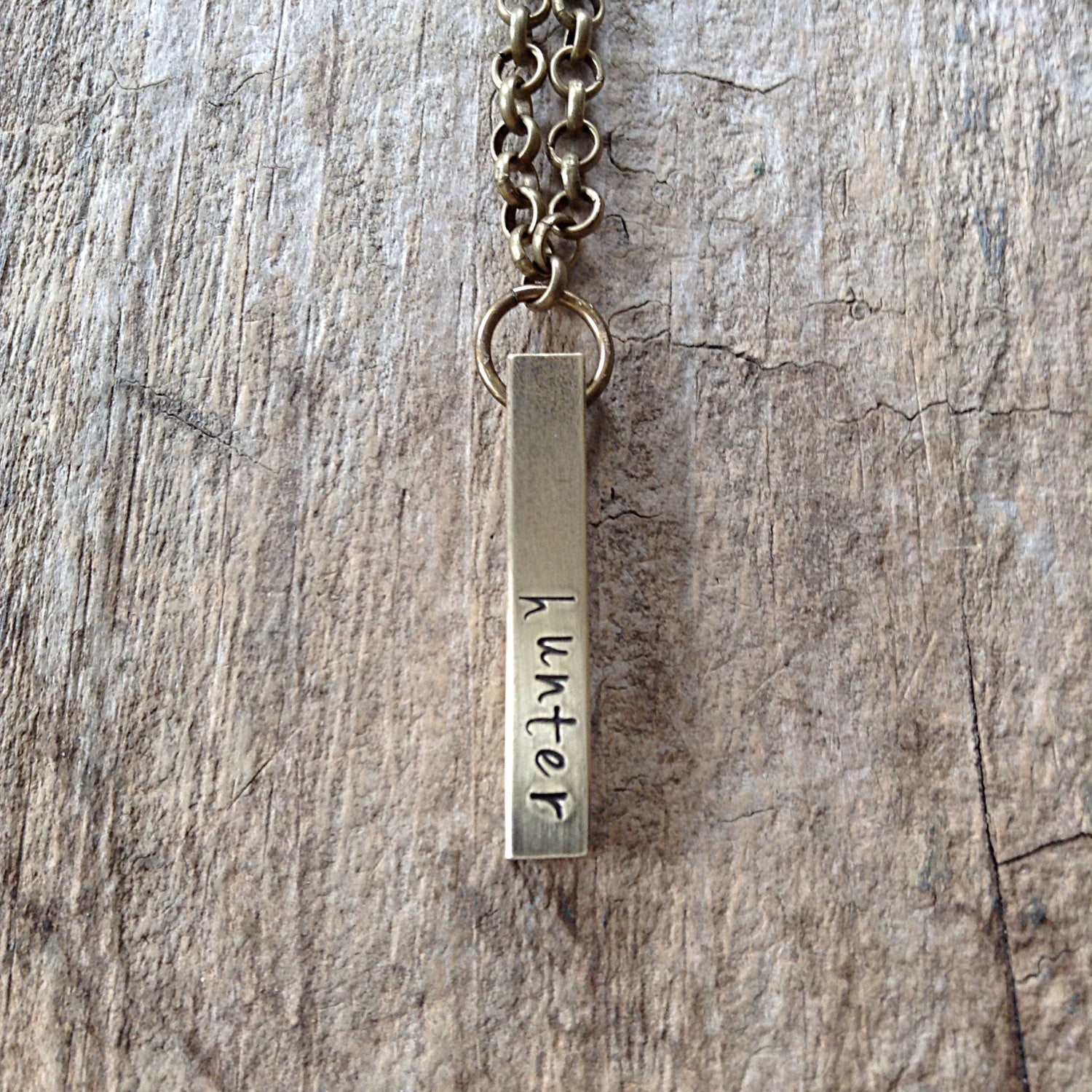 A simple yet rustic piece created entirely of antique brass. Featuring a solid brass square bar which can be personalized with names, dates, words on each of the 4 sides. Suspending from a thick and sturdy link chain, this square bar is given an antiqued finish.