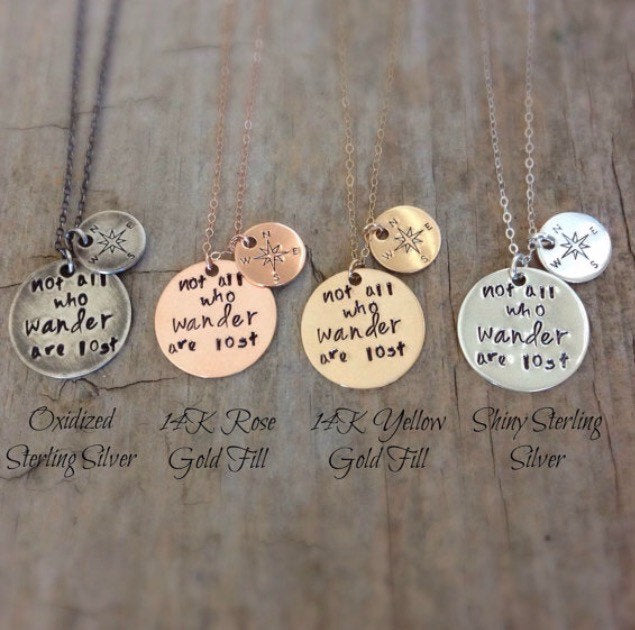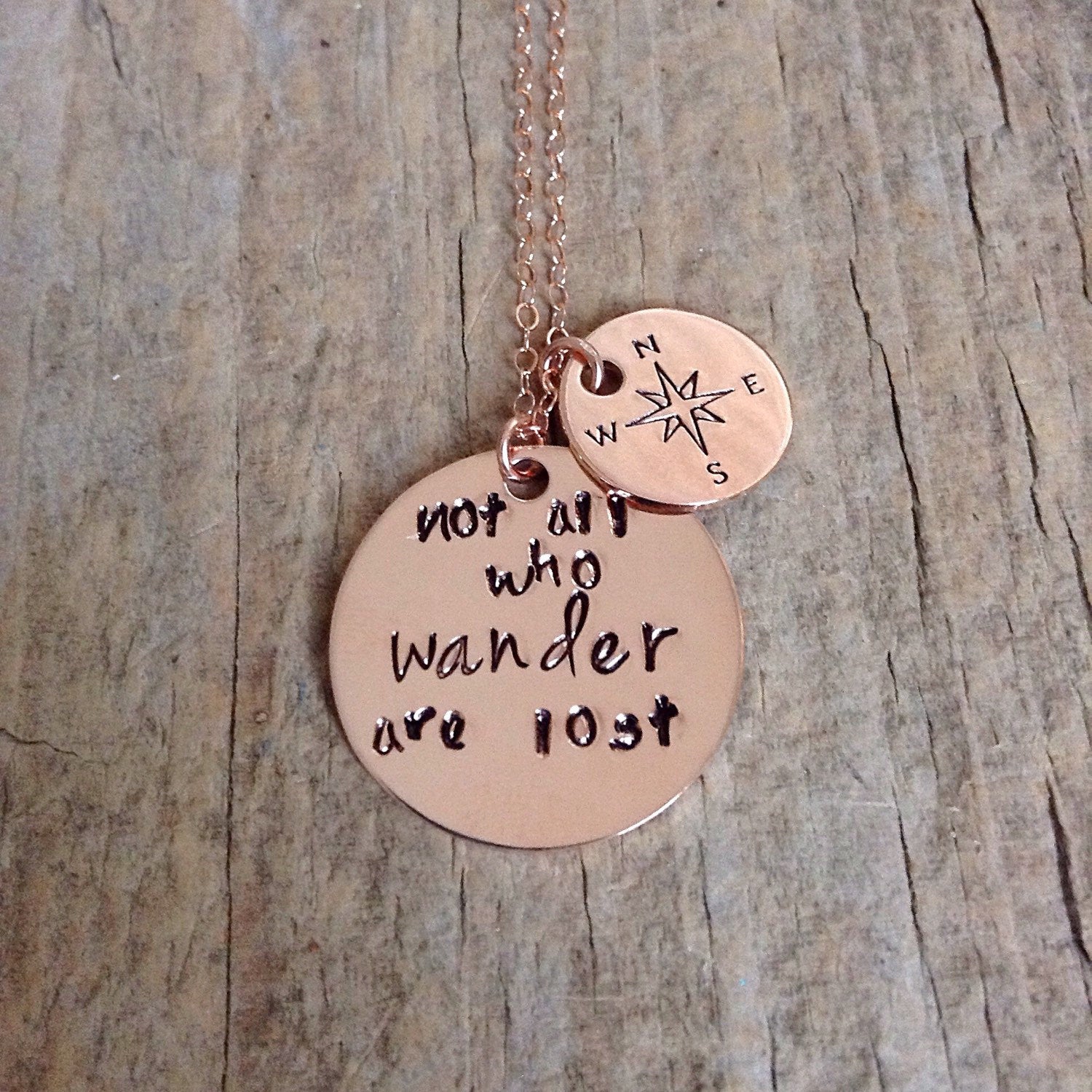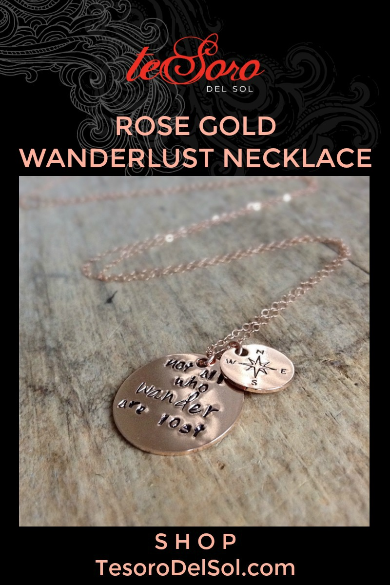 After many requests for a 14K rose gold fill version of this necklace, here it is. My popular "Not All Who Wander Are Lost" necklace is now available in 4 metal finishes, all in this boho luxe style. A great piece for the travel lover, and free spirit. This one is handcrafted entirely of 14K rose gold fill, from both disc charms to the chain and links. This hand stamped necklace is a great simple addition to your everyday modern bohemian look and can easily be layered with my other necklaces. I can make this in a variety of lengths. Simply choose your preferred chain length from the drop down menu.Â