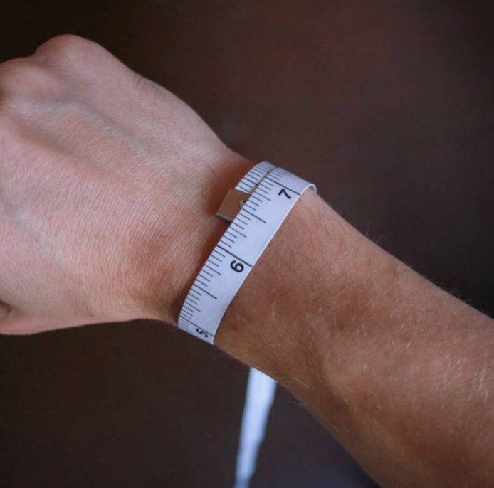 2) If you are using a strip of paper, ribbon or cord instead of a tape measure, mark the end of the strip after wrapping around the wrist and then measure that length against a ruler. This is your wrist size.