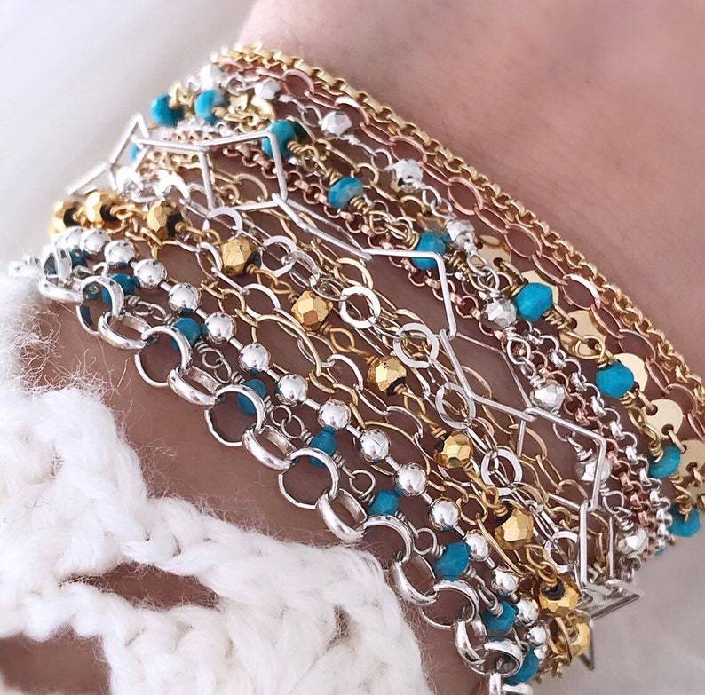 Build your own rose gold bracelet stack by layering these dainty rose gold filled bracelets together. Simply select the letter(s) of the style(s) you want to add to your collection. Summer boho bracelets with a minimalist feel that can be worn by day or evening, or even given as bridesmaid gifts. They're also lightweight and comfortable enough to wear as an anklet. Choose your applicable size from the drop-down menu to complete your layered stack. More styles also available in silver and gold too!