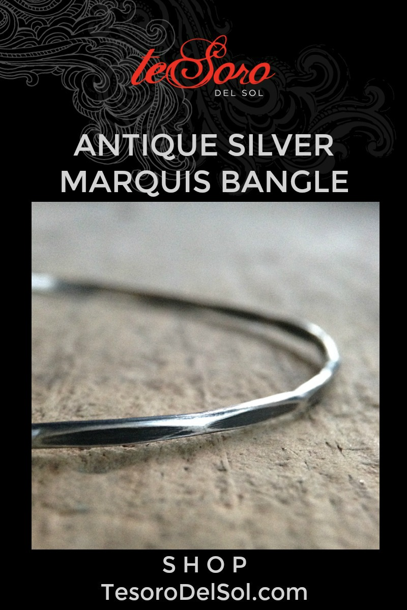 This antique silver bangle is perfect for stacking with other bracelets and bangles. With its textured design for a marquise effect, this bangle makes it so simple to accessorise, just swipe over your wrist and mix with your other jewelry essentials. This collection is available in vintage sterling silver, shiny sterling silver, vintage brass, vintage copper, 14K gold filled and rose gold filled.