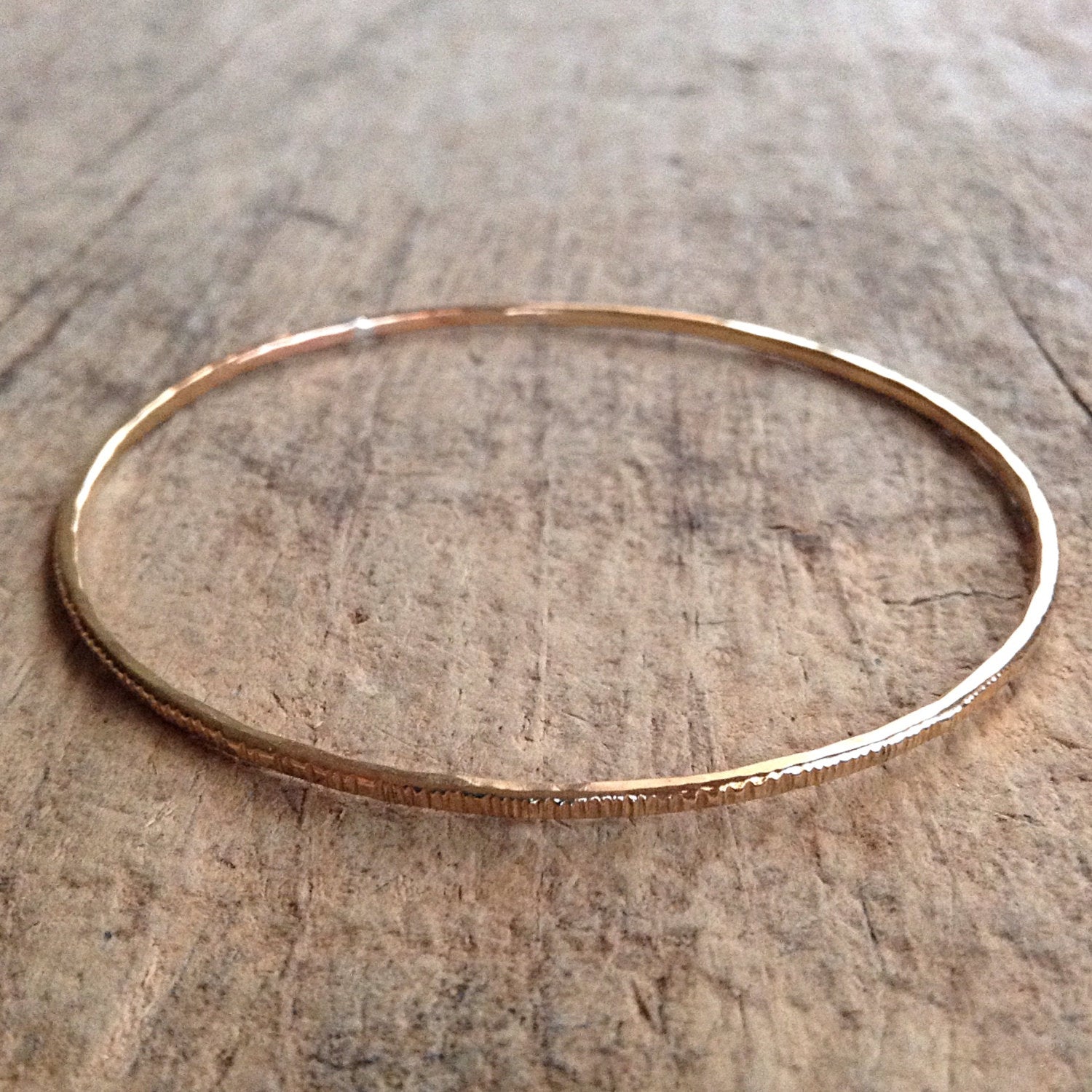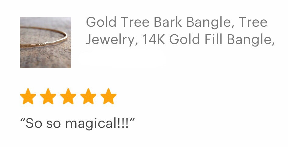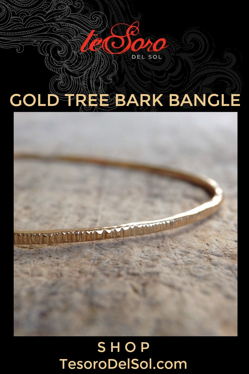 A 14K gold filled tree bark bangle that can be worn alone or stacked. This texture is also available in shiny sterling silver, antique silver, black silver, and 14K rose gold filled. A great addition to your collection of bangles, cuffs and bracelets to achieve your boho-luxe look! Stack them for a more luxurious style.Â
