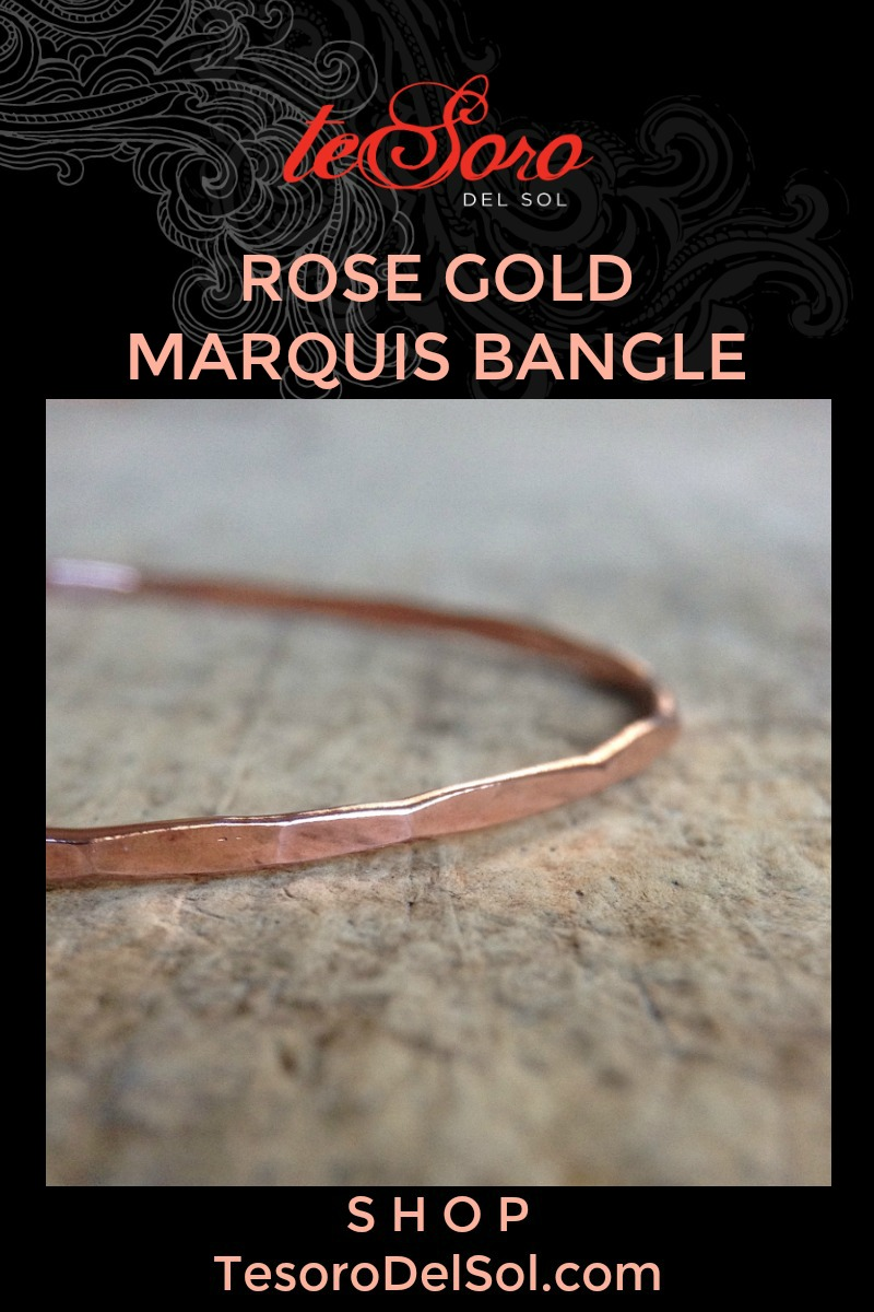 One of my all-time fave patterns, this 14K rose gold filled stackable bangle has been delicately crafted with a diamond or marquis pattern on the surface for the ultimate vintage look and feel. Polished to a high shine, the light reflects on each angle for a touch of sparkle.