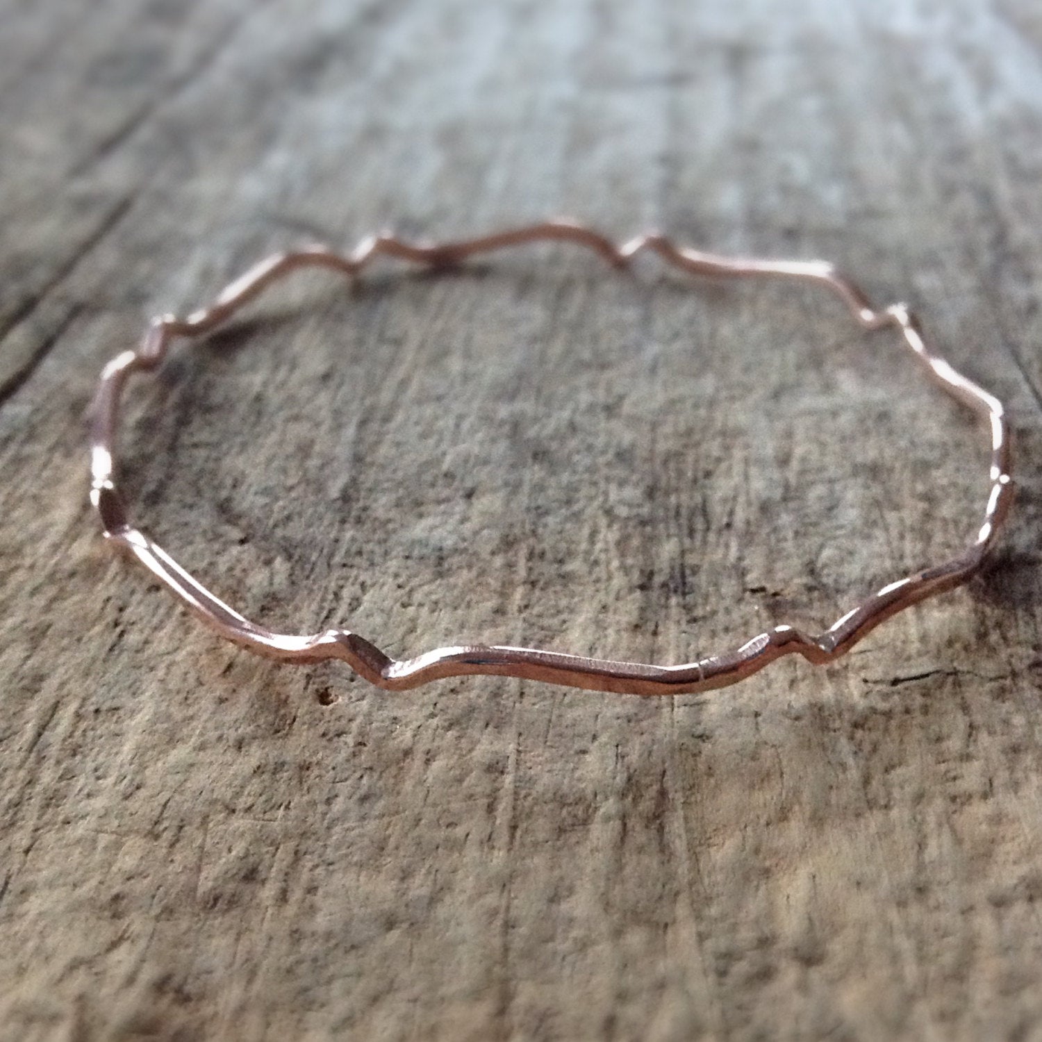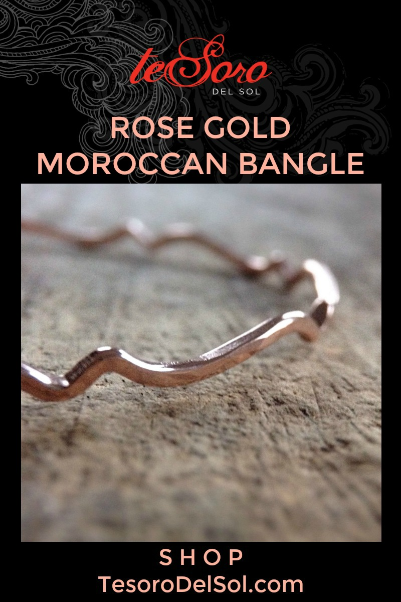An exotic bohemian bangle that's easily stackable with other bracelets and bangles. This rose gold filled bangle has been forged into a scroll design, then given a subtle antique finish. To wear, simply slide it over your hand. This collection is available in vintage brass, vintage sterling silver, shiny sterling silver, vintage copper, 14k gold filled and rose gold filled. Please select your preferred finish from the drop down menu.