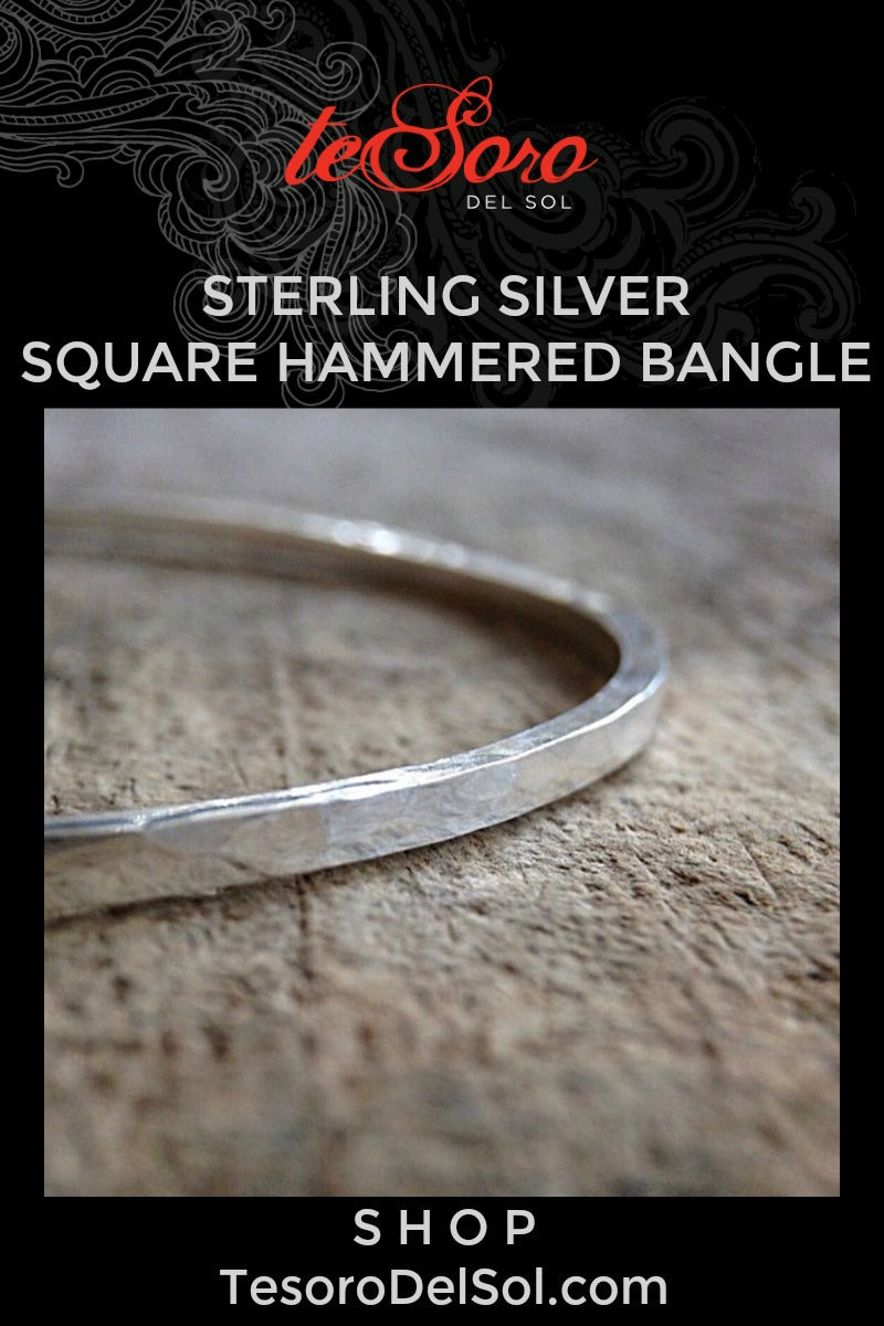 This will become your go-to boho bangle! This sterling silver square wire bangle has been hand forged and hammered to give it it's subtle faceted effect allowing the light to reflect off of it. A bohemian piece that's easily stackable with other bracelets and bangles. To wear, simply slide it over your hand.
