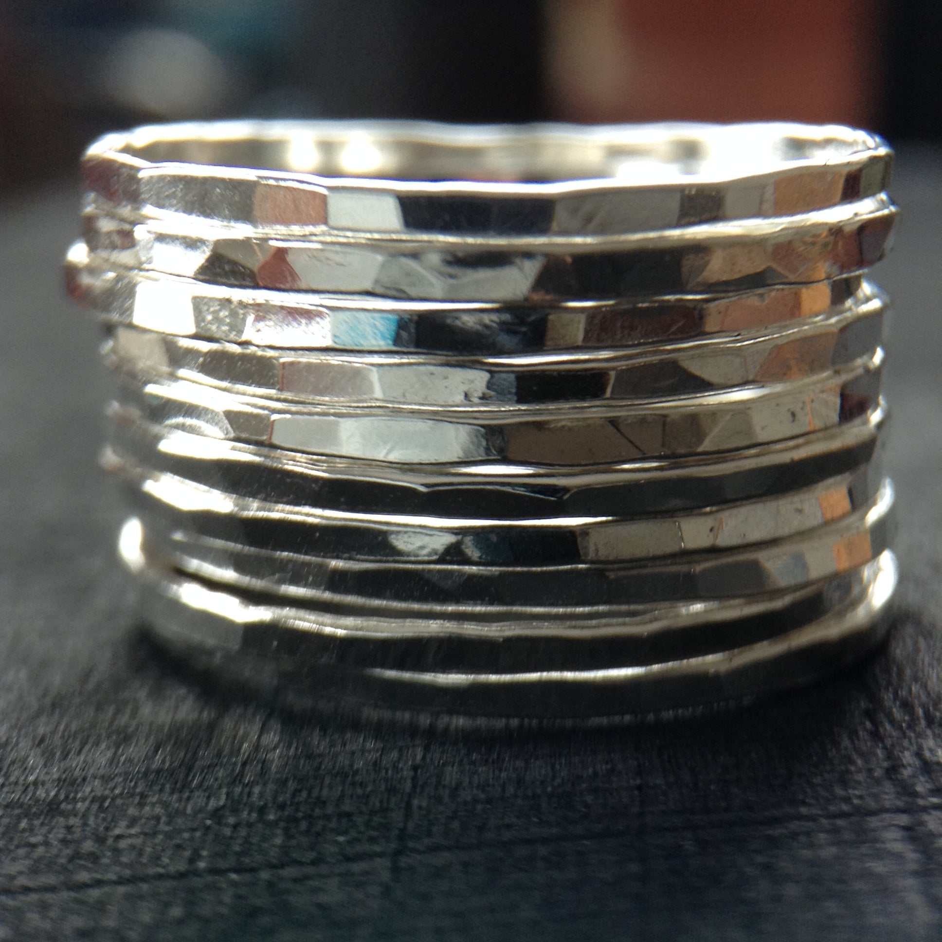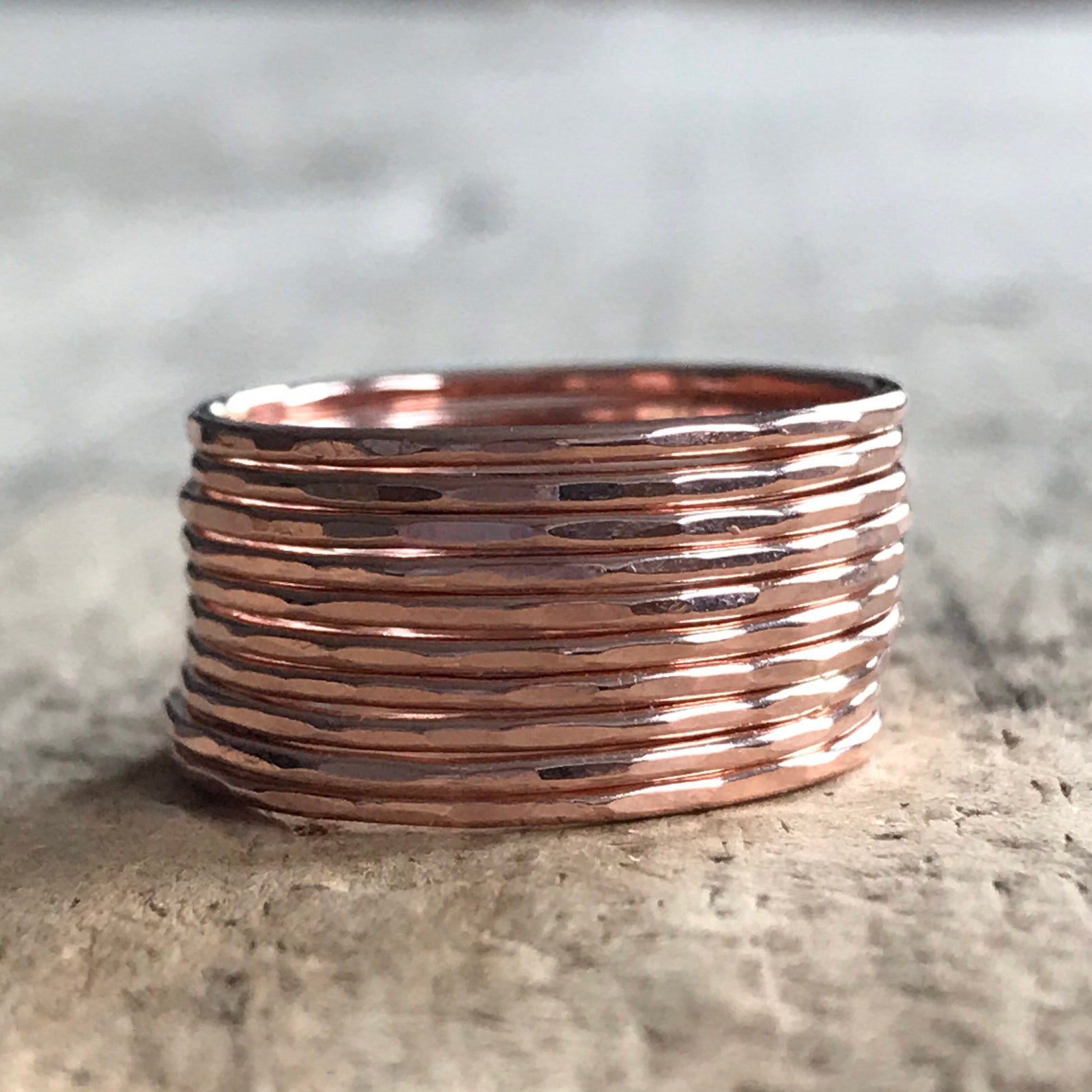 14K Rose gold fill and hand forged, these stylish skinny rings are hammered to a delicate texture, tumbled and polished to a high shine for the ultimate classic boho look. Each band is just 1mm wide, perfect for stacking with other skinny rings. 10 rings together would measure about 10mm wide. These stackables are made to order for your ring size and feature a slightly antiqued boho look and feel, adding a touch of simplicity.