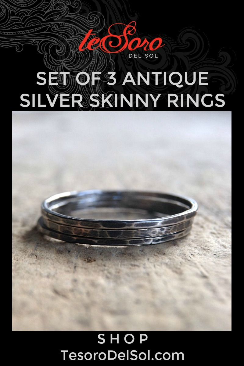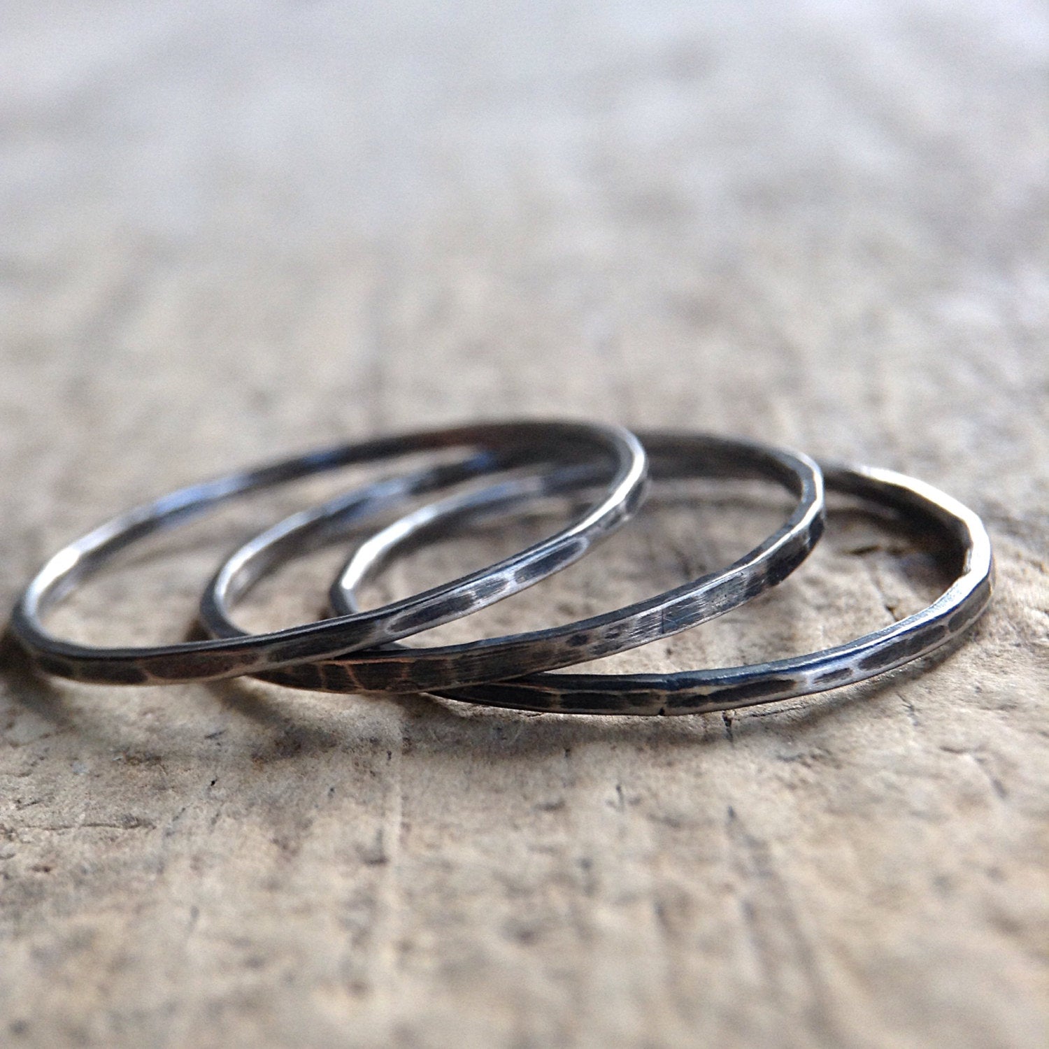 A sleek little ring stack will be made to order in the ring size of your choice. Created entirely by me in solid sterling silver, these awesome skinny rings is completely hand forged, hammered for texture, tumbled and blackened. Each ring is approximately 1mm wide, so 3 worn together measure about 3-4mm wide.