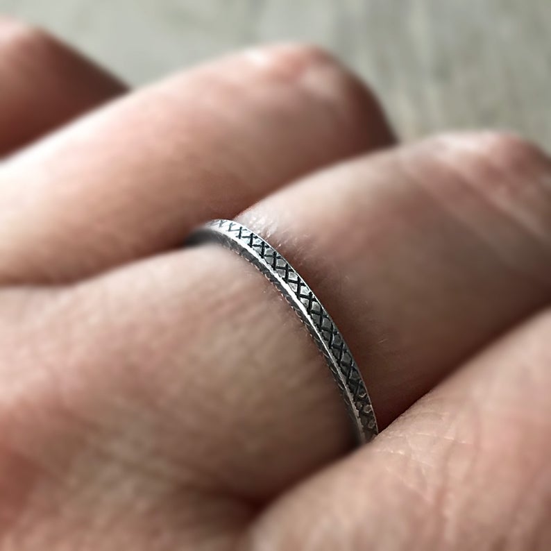 This simple antique sterling silver ring depicts a cross-hatch pattern around the outer and inner surface of the band. Easily stackable with my other skinny rings. Choose from shiny silver and this antique silver from the drop down menu.