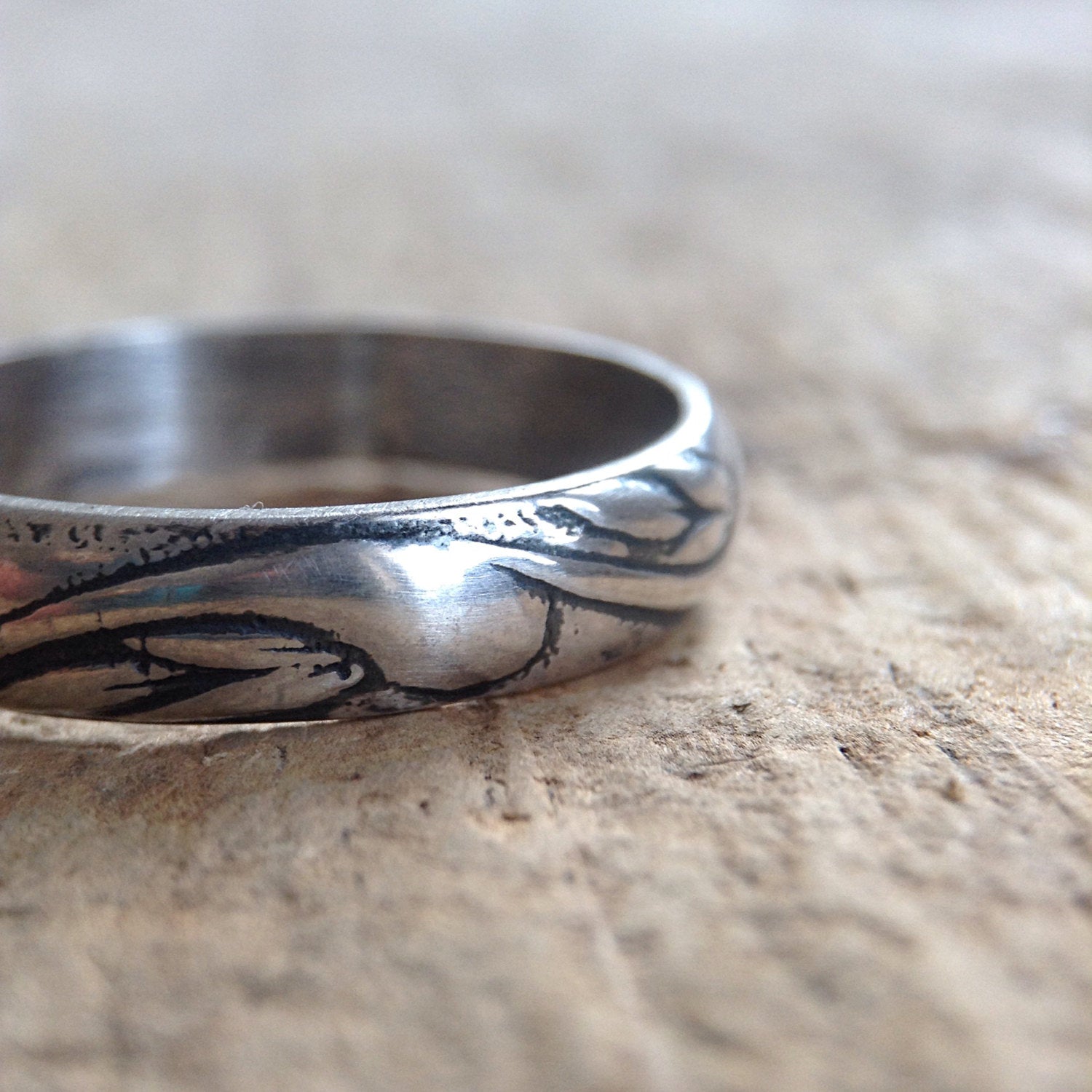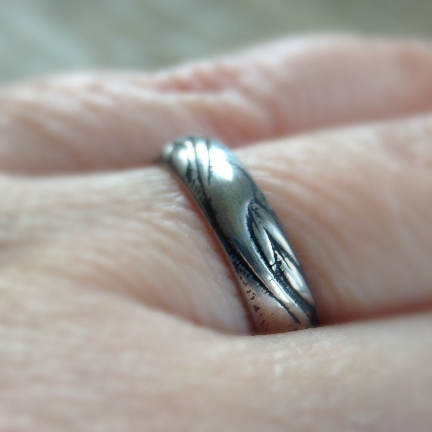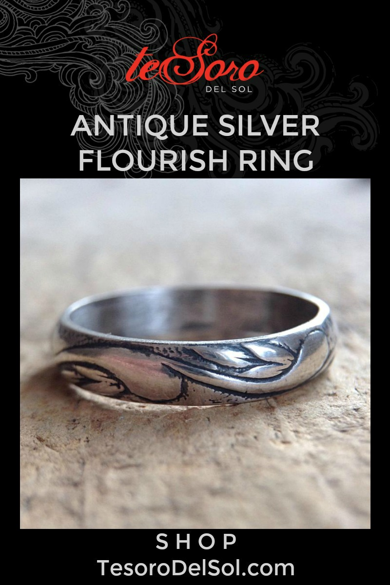 With a feminine flourish pattern, this sterling silver ring is lightly oxidized with a black finish for a bold statement. The ring can be added to your jewelry collection along with your other stackable skinny ring bands if you're a fan of the mix and match style. Measures approximately 5mm wide and made to order in your size.