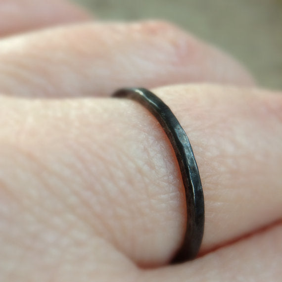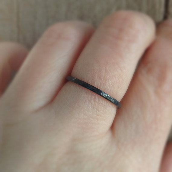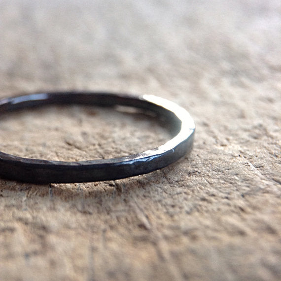 A simple yet rustic ring band created entirely of sterling silver with a black finish, and easily stackable with other skinny rings or worn alone. These rings have been hand forged, hammered with a faceted texture, and polished to a high shine, allowing them to reflect light.Â