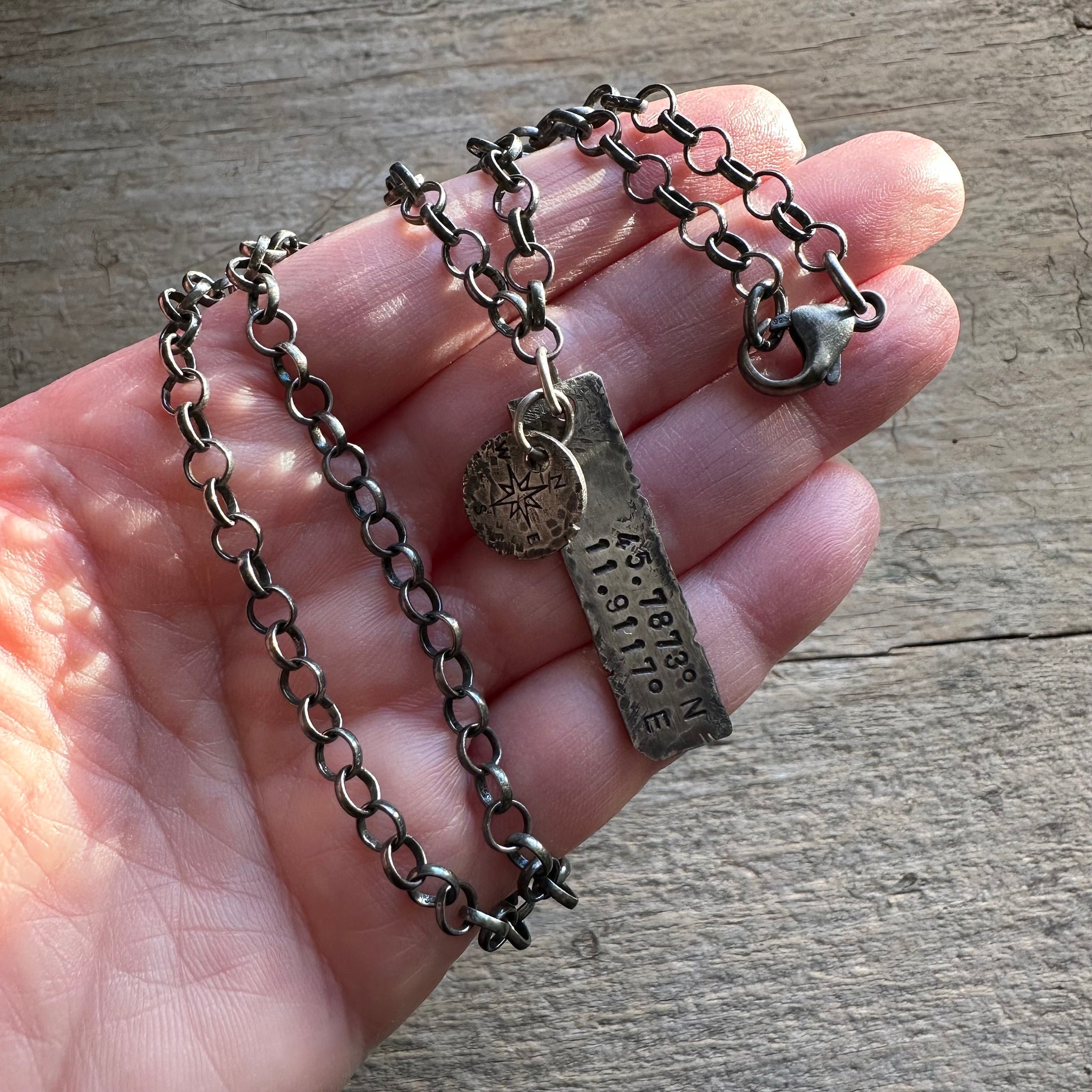 Keep your favourite place close to your heart with this custom coordinates necklace which I'll create with your memorable latitude longitude GPS coordinates. This piece is created entirely of sterling silver and has been given a distressed and oxidized finish. Simply choose your preferred length from the drop-down menus provided.