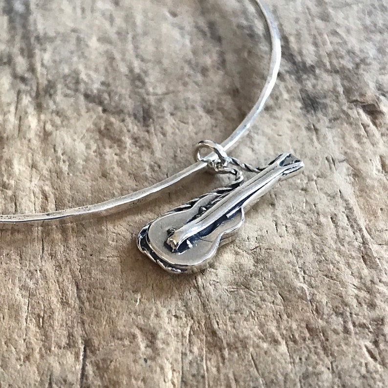 A guitar charm dangles from a thin hammered sterling silver bangle bracelet that can be worn alone or stacked with others. A great addition to your bangles, cuffs and bracelets! Choose your size from the drop-down menu.