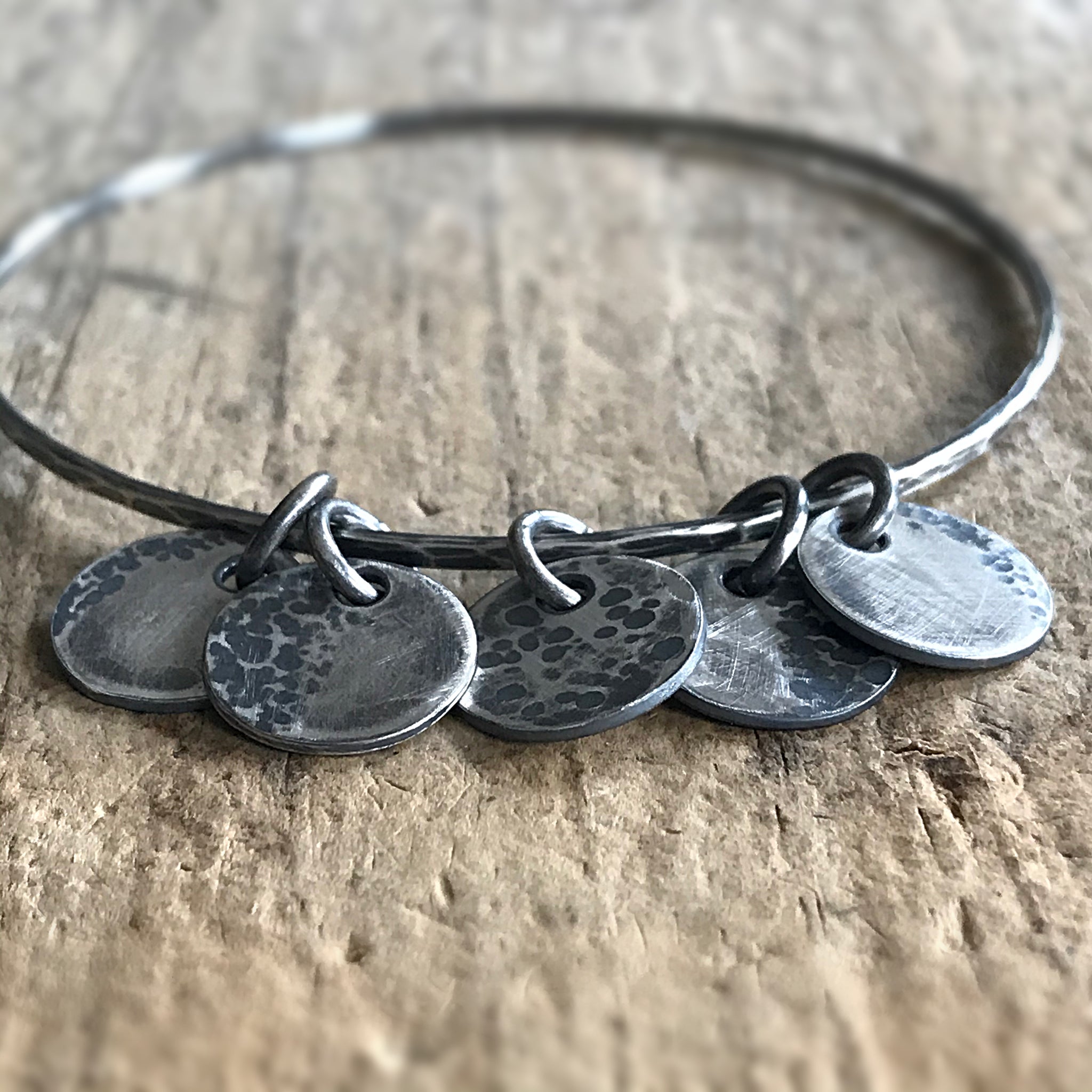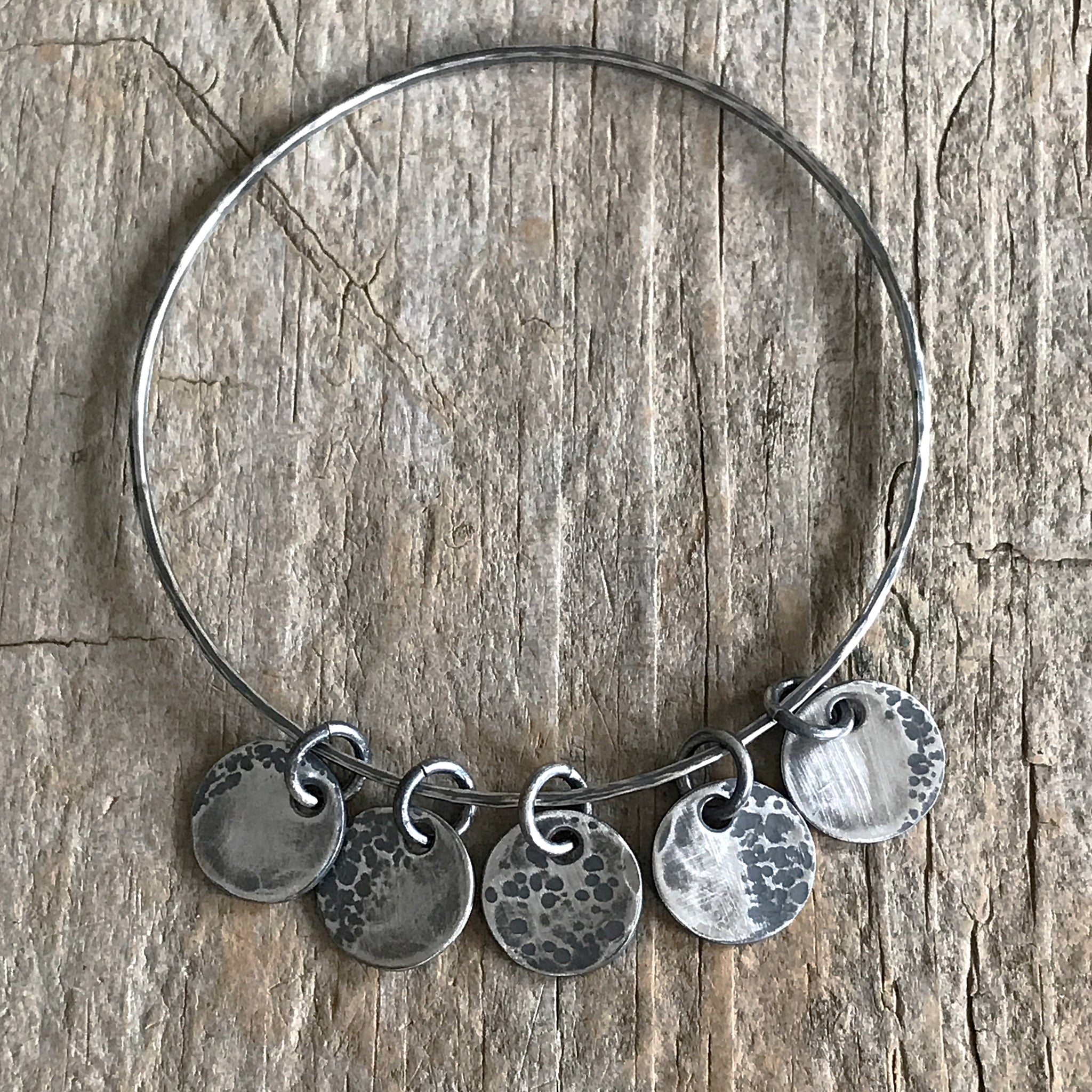 You are a moon lover, you love all that she represents, embodies, and how she casts her glow upon you from the nights' sky. For my fellow selenophile, this sterling silver moon phase bracelet is for you. It depicts five of the moon's phases, such as full moon, crescent moon, and quarter moon, each suspending from a solid sterling silver bangle, allowing them to move freely. Shown here is the antiqued version because I love how it picks up all the details I created to resemble the moons surface, however, I can create this bracelet in a polished finish for you with a more understated look. Perfect as celestial gifts for the moon lover in your life.
