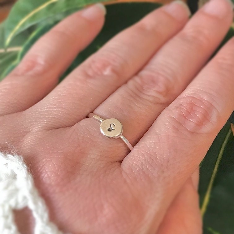 This slightly rustic yet petite sterling silver monogram ring is impressed with one letter of your choice in the lower case cursive font shown. Created entirely of solid sterling silver, this initial ring will be a favourite among your stacking ring collection. The hammered ring band, has been entirely hand forged and textured. Made to order in your size. Please note that each pebble is formed by molten silver, so no two pebbles will ever be exactly the same size or shape, which adds to their individual handmade character.