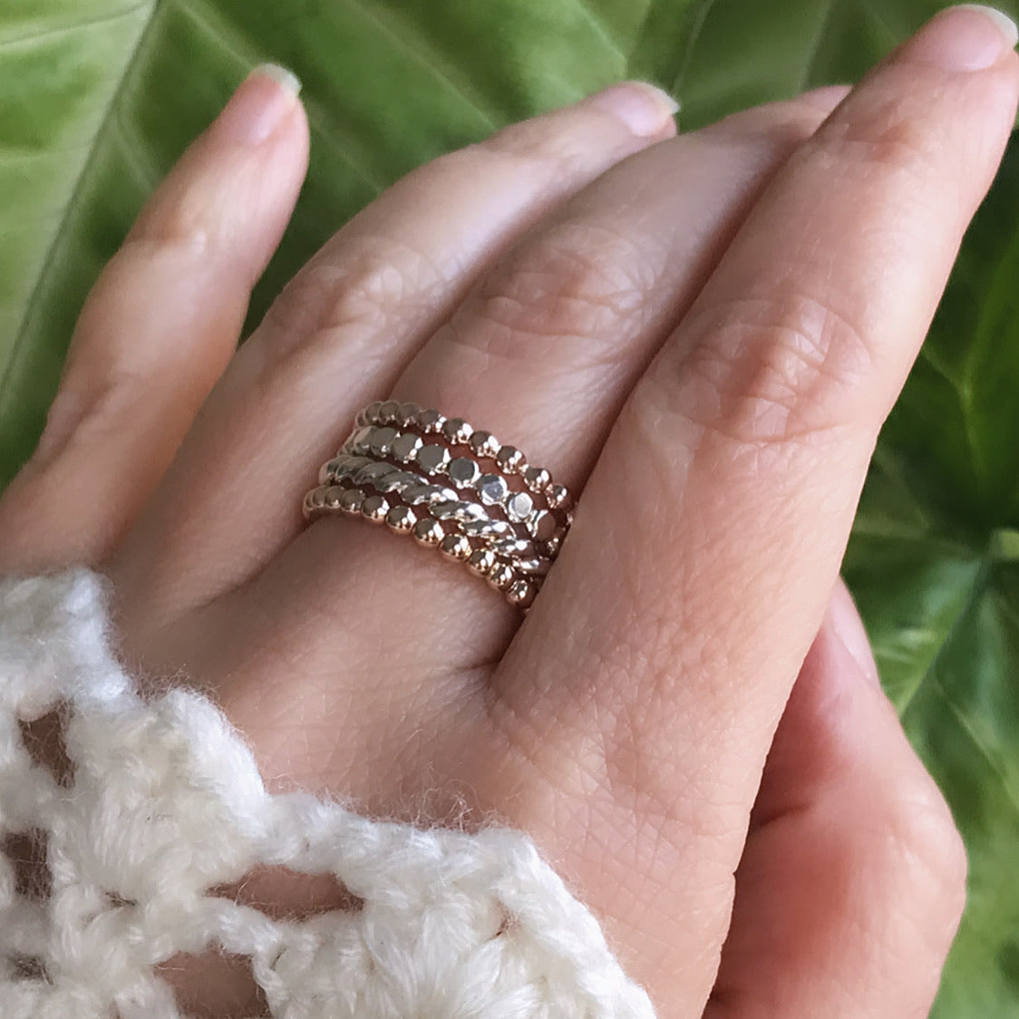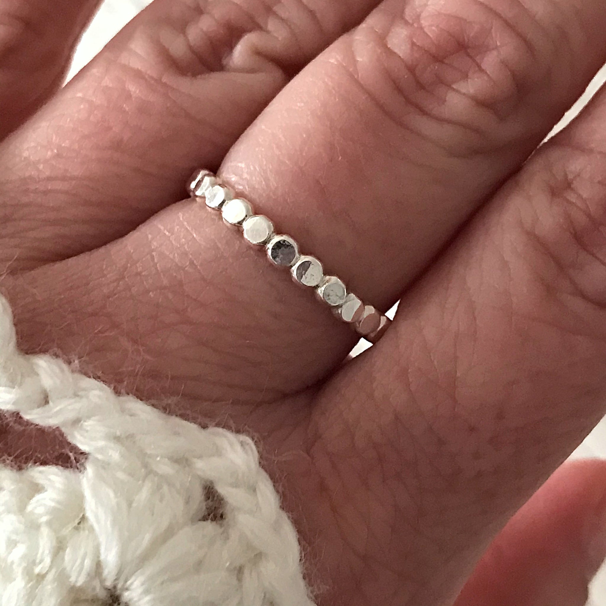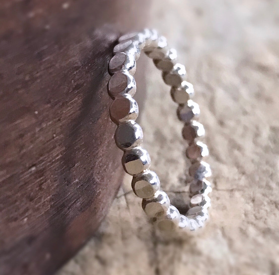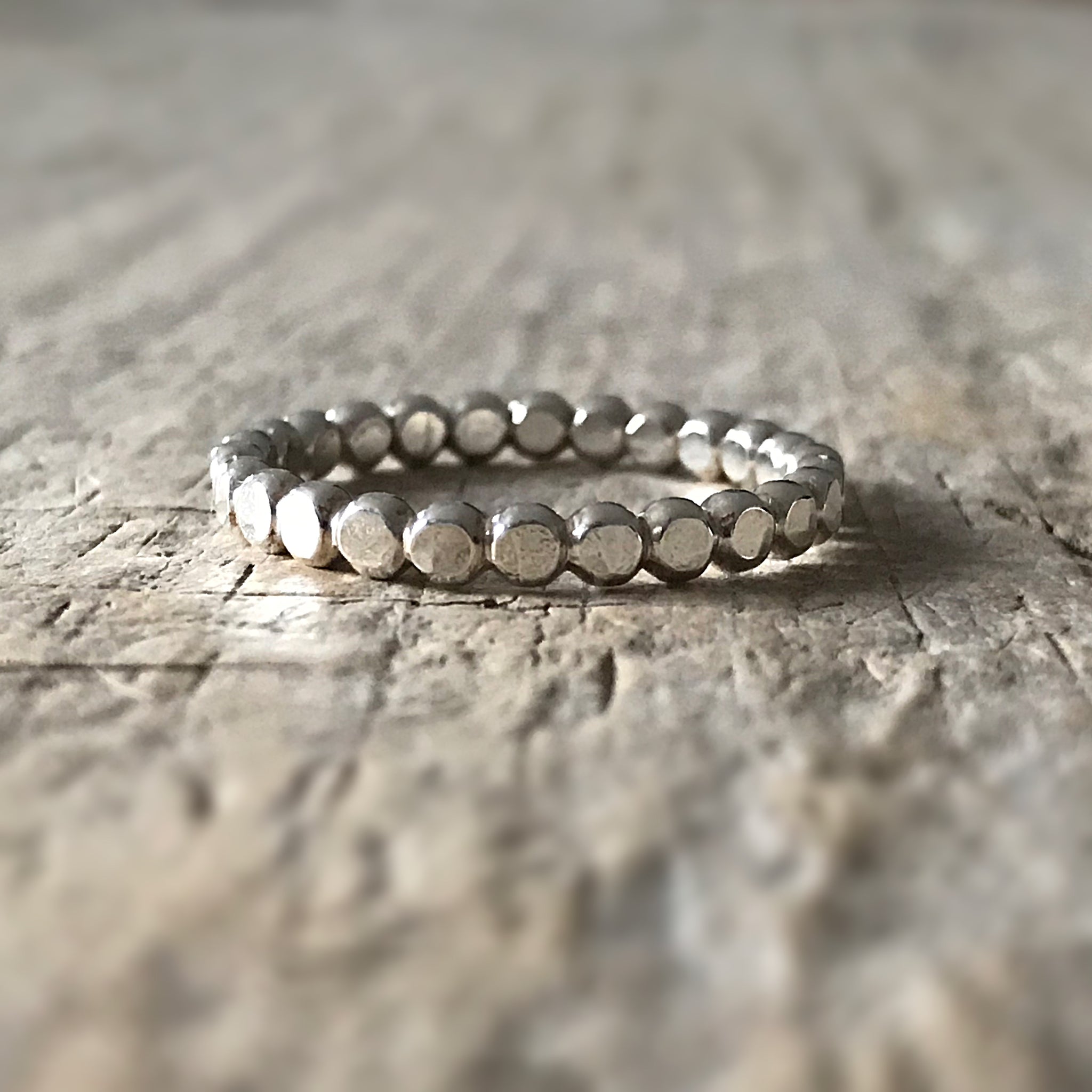 The perfect match to my pebble earrings is this minimalist ring featuring tiny pebbles lined up and hammered with a faceted texture. This beaded ring band is created entirely of sterling silver and polished to a high shine. Will be made to order in the size and finish of your choice.