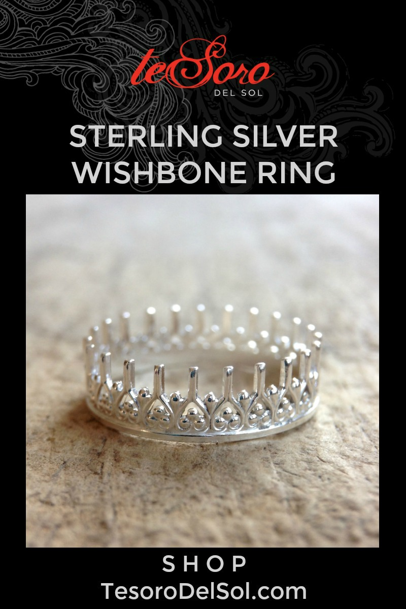 Another one of my crown rings created entirely of sterling silver. The wishbone ring design has a series of inverted hearts depicting love in a filigree design style. Easily stackable with my other rings. Choose from shiny silver, antique silver and black silver from the drop down menu.
